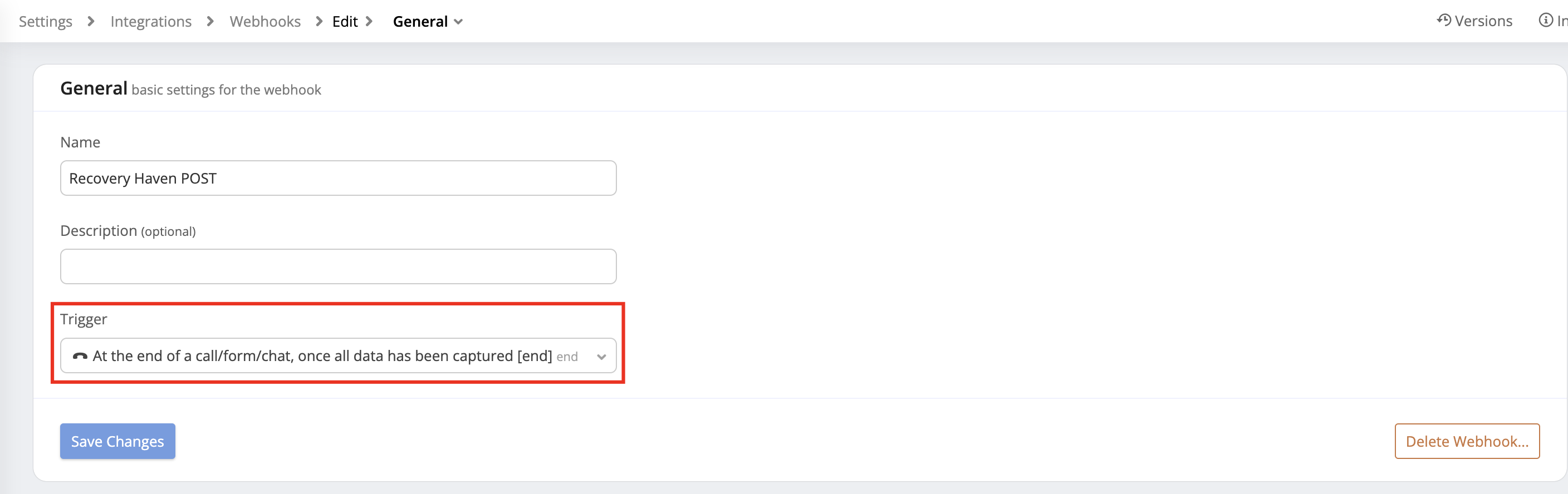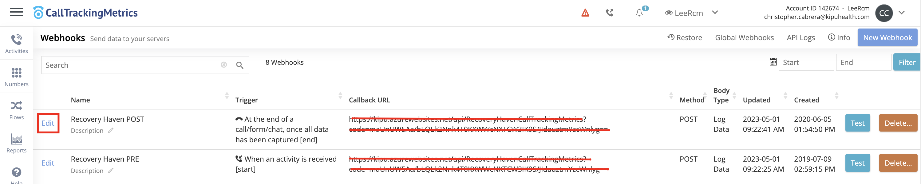 - Locate the Kipu Post-Call Webhook. This will be the webhook containing the trigger set to "At the end of a call/form/chat, once all data has been captured [end]." Select Edit.
