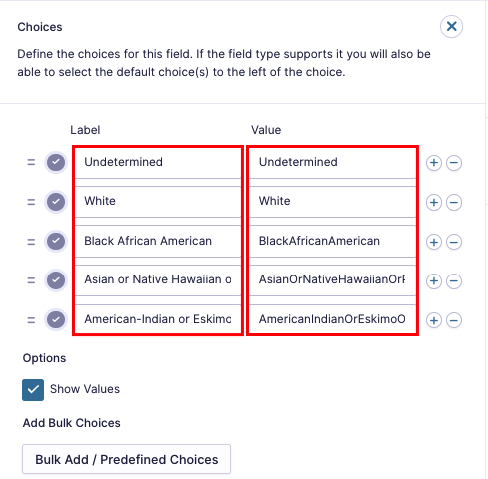 - Enter all Races as the Labels followed by entering corresponding Values. Unlike Labels, Values must contain no spaces.