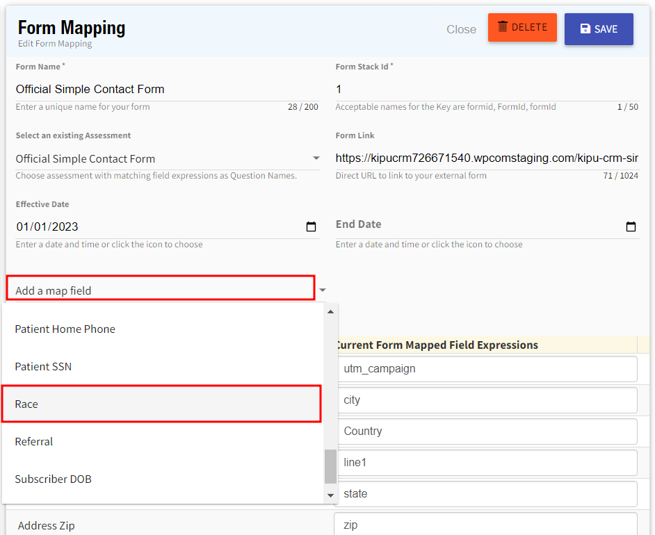 - Return to the Kipu CRM. Navigate to CRM > Organization > Tenant > Tenant Formstack Maps