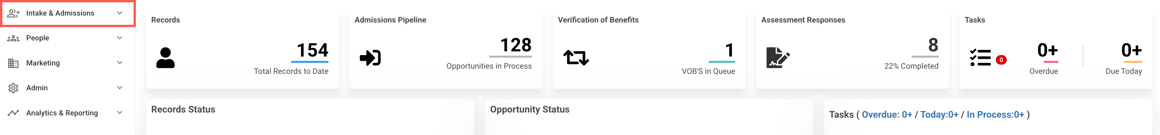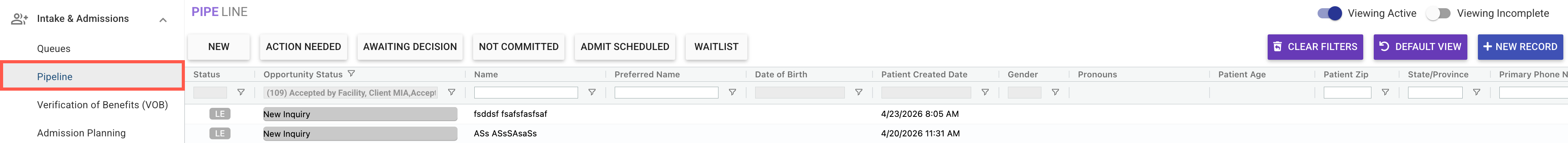 - When the admissions pipeline is toggled to Viewing Incomplete, it will display all open and in-progress treatment opportunity records.