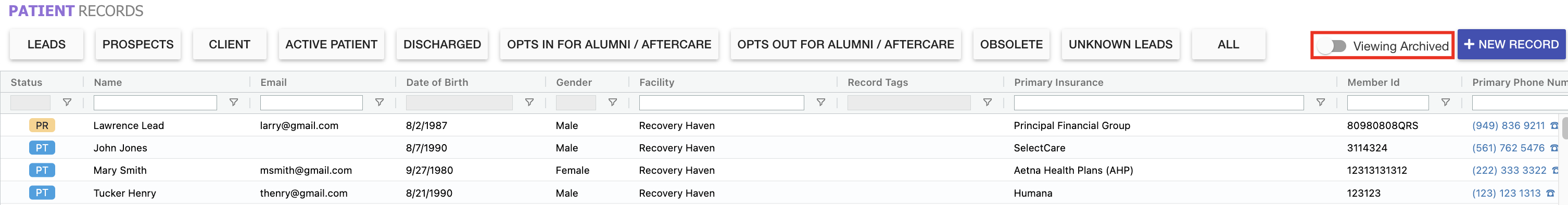 - When the Prospect/Patient Records Grid is toggled to Viewing Archived, it will display all inactive and archived patient records in your CRM tenant.