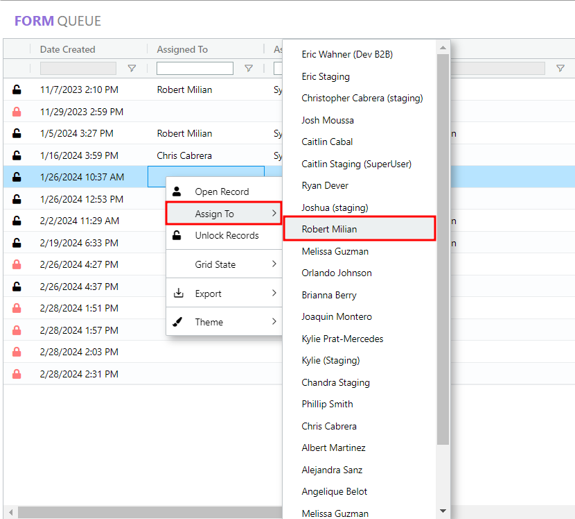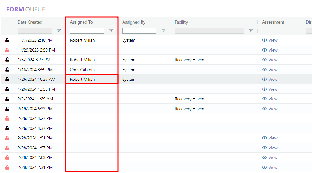 - The Form Queue Record will display the designated assignee in the Assigned To column.