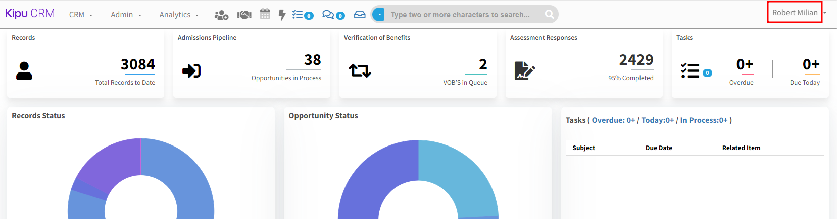- You should now have been directed to the Kipu CRM Landing Page with your user name displayed in the upper right-hand corner of the screen.