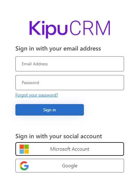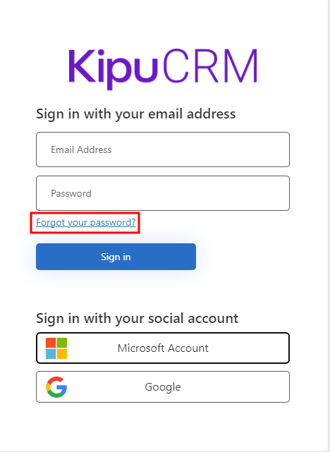 If a Kipu CRM user password has been forgotten, it must be reset from the login page using the Forgot your password link and follow the prompts.