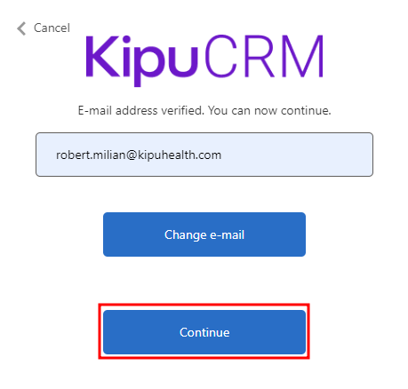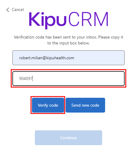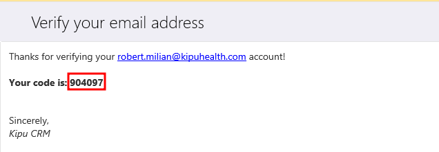 - While keeping your current webpage open, navigate to your email provider open an email with the subject line Kipu CRM account email verification code, and copy the code.