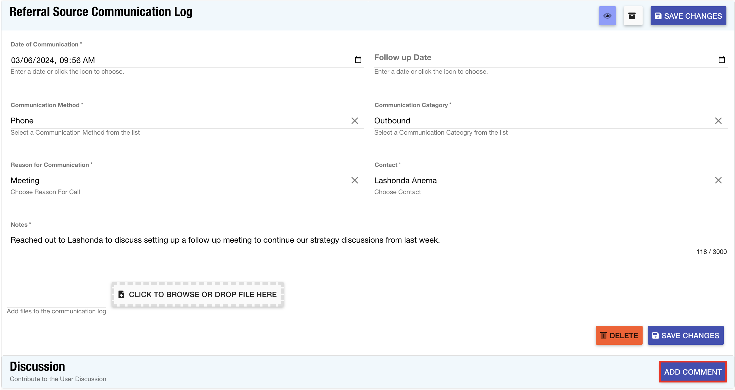 To utilize the discussion feature, the user must access an existing Referral Source communication log record in the system.