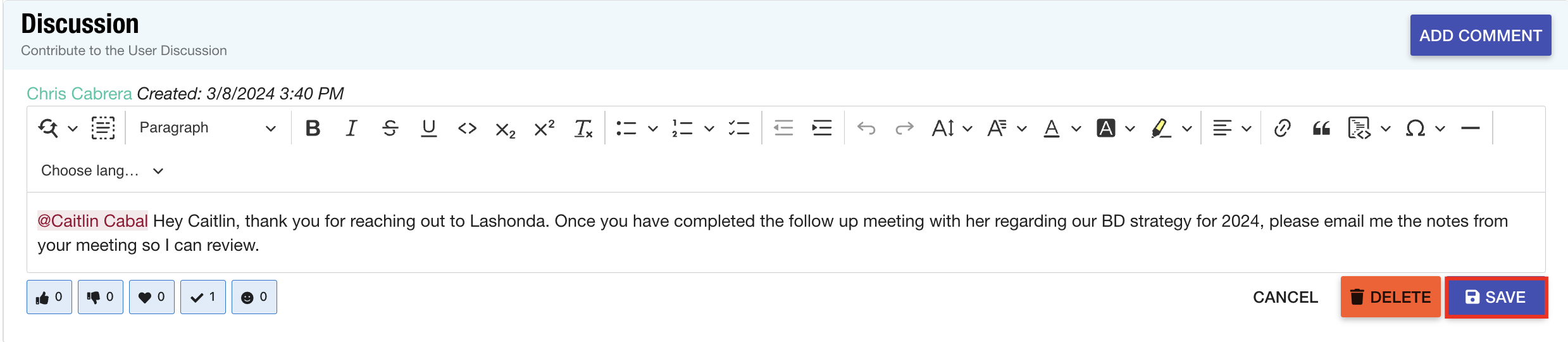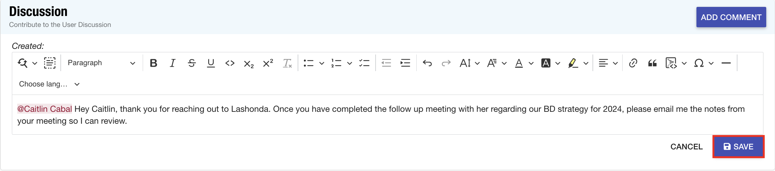 - The discussion area will be located directly beneath the communication log. Select Add Comment to begin creating your post.
