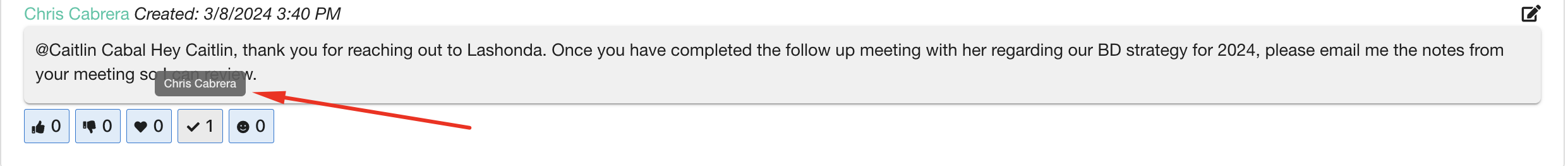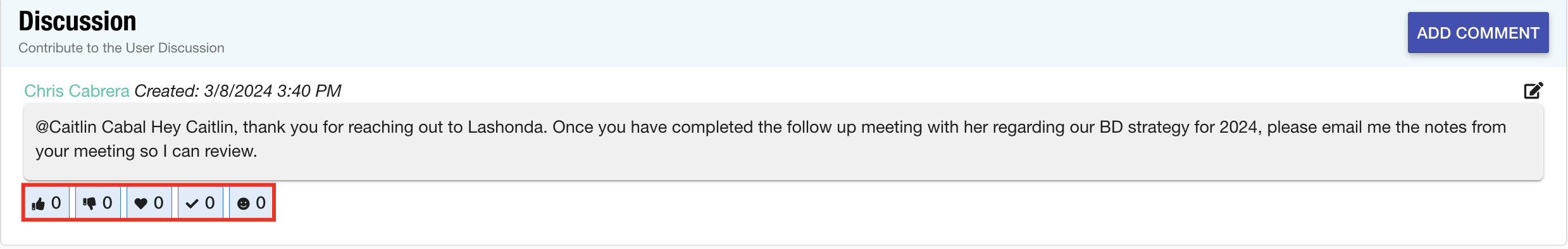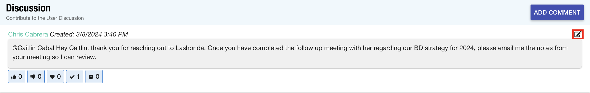 Hover your mouse over the reaction to view the user who applied it. - In the case that you need to edit your comment, select the edit icon.