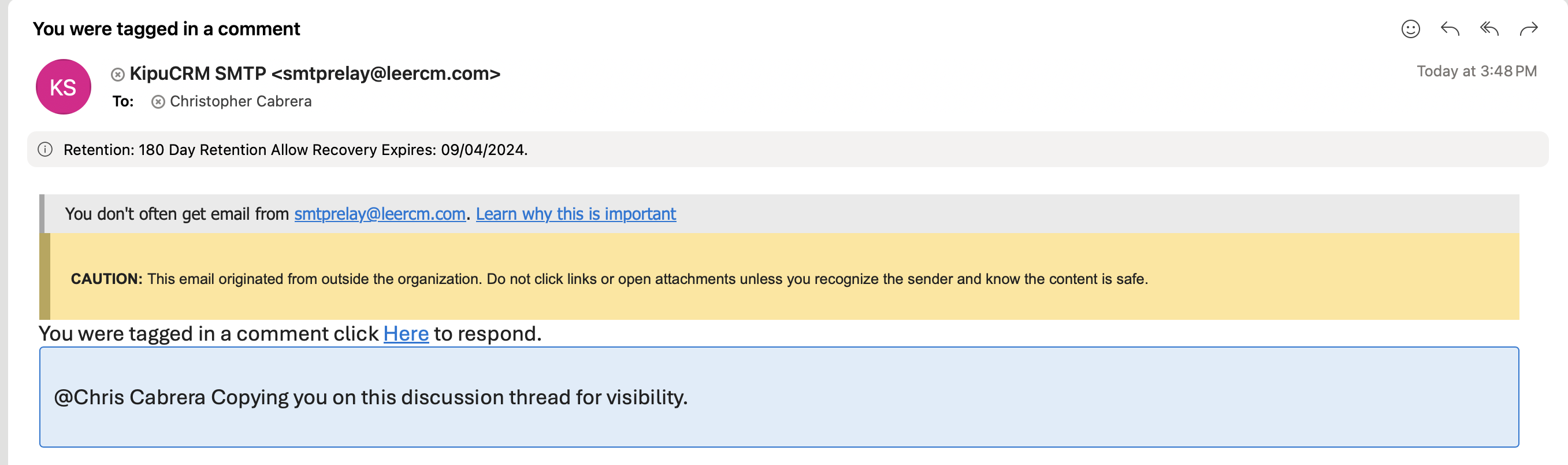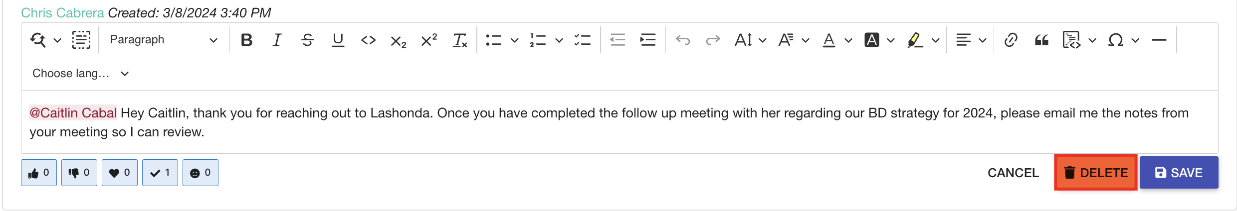 To mention other CRM users in your comment, just use the "@" sign to access the pick list of users in your tenant, and choose the desired recipient. Tagged users will receive a notification in both the in-app notification center and their email.