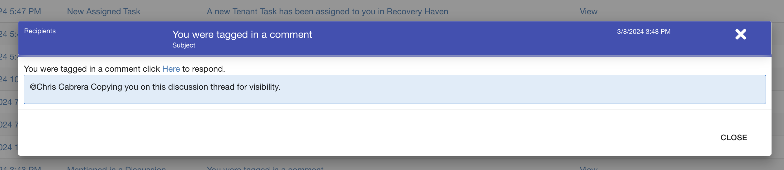 Each time someone is tagged in a discussion, there will be a notification sent out. Please refer to the section below to view examples of each type of notification.
