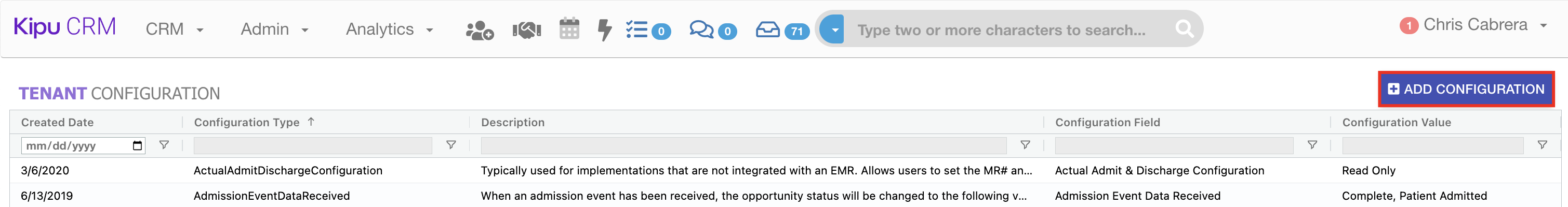- You will be returned to the Tenant Configuration grid. Select Add Configuration.