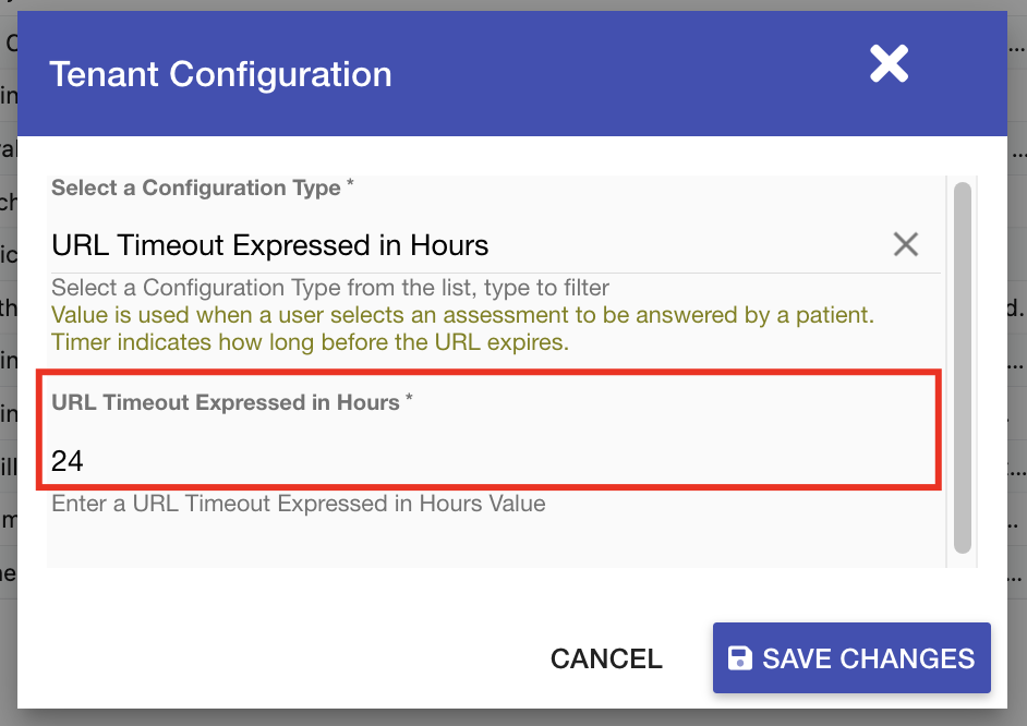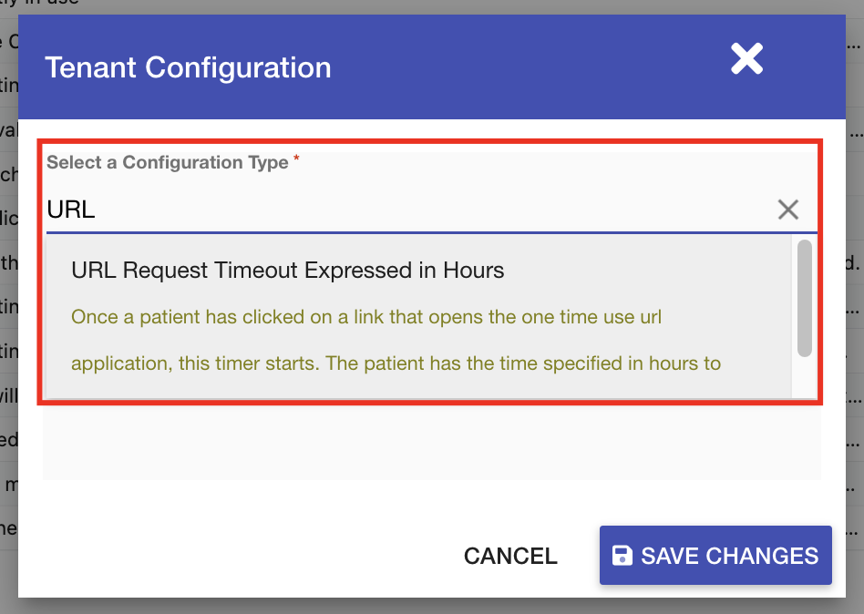 - In the Select a Configuration Type field, search & select the URL Request Timeout Expressed in Hours configuration.