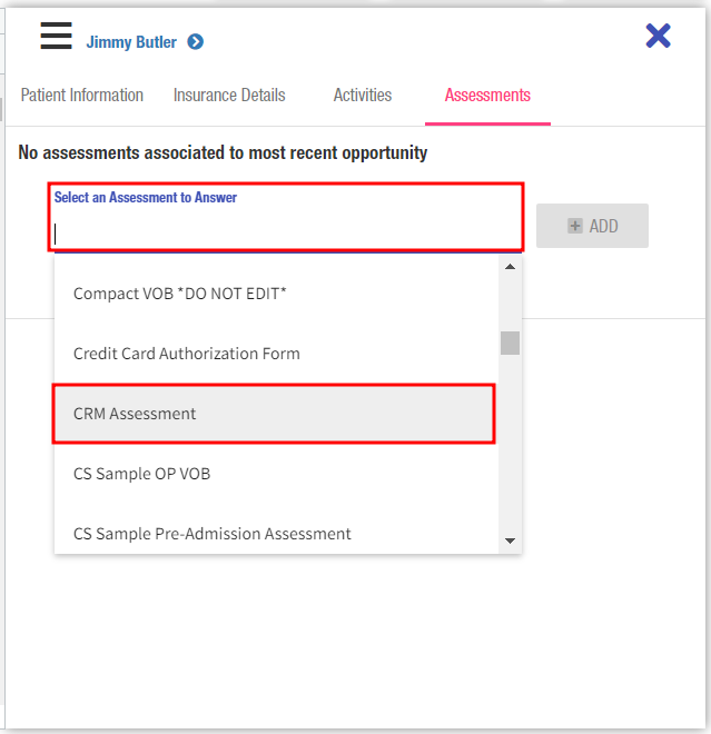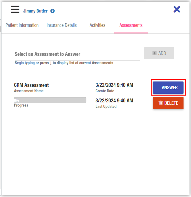 An assessment can be completed directly from the focus panel whether from within the Patient Records grid or the Admissions Pipeline. Simply navigate to the Assessments tab within the panel and choose an assessment to answer.