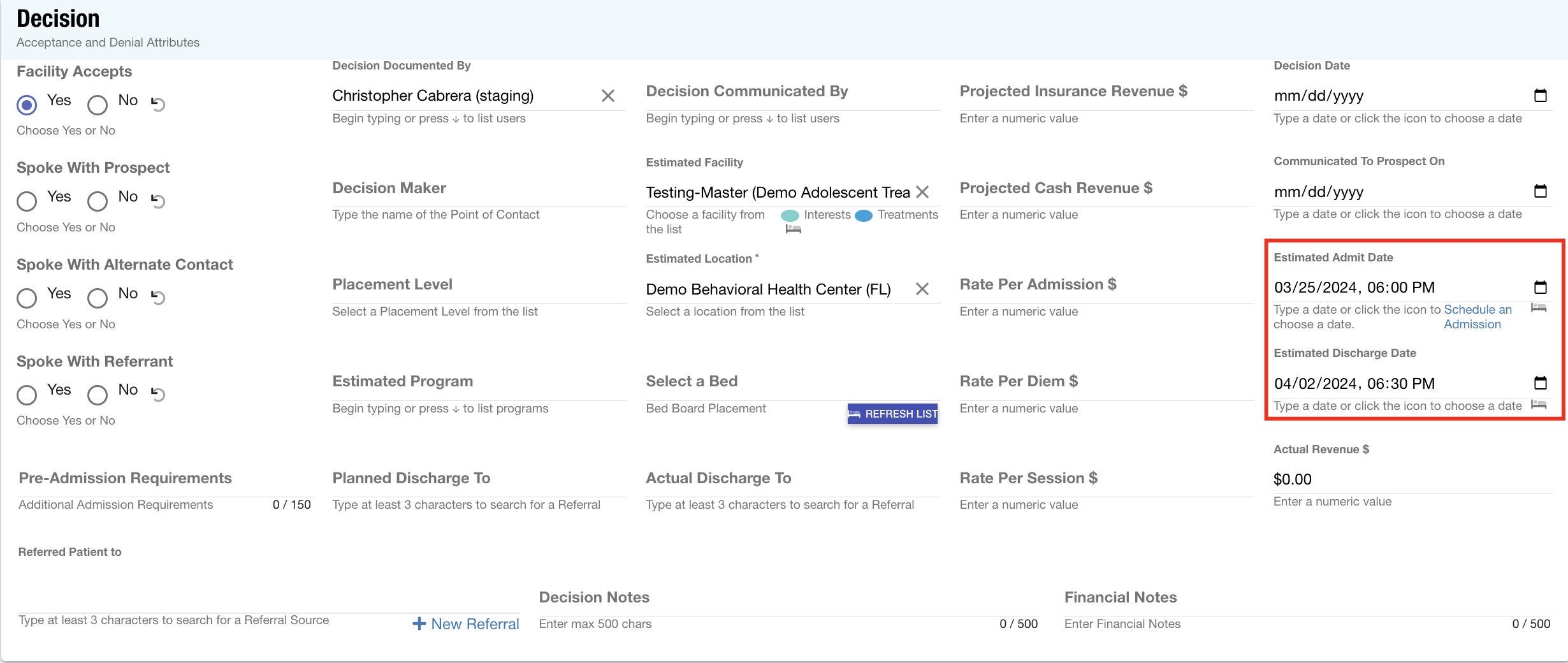 Bed Board: The estimated admit date and estimated discharge date fields have been updated to date/time controls to facilitate accurate bed planning.
