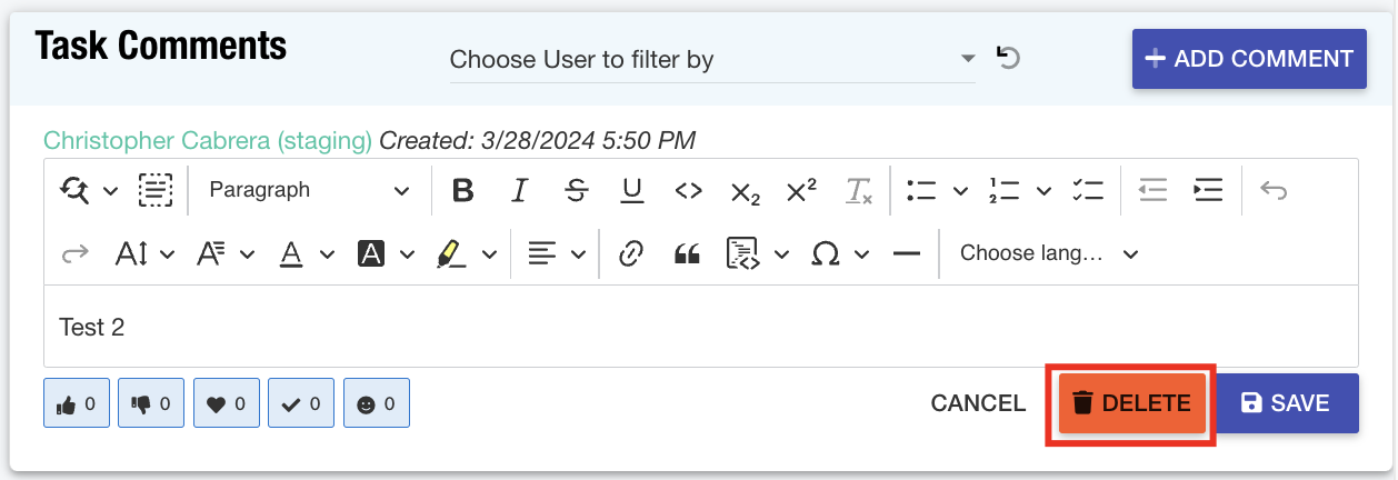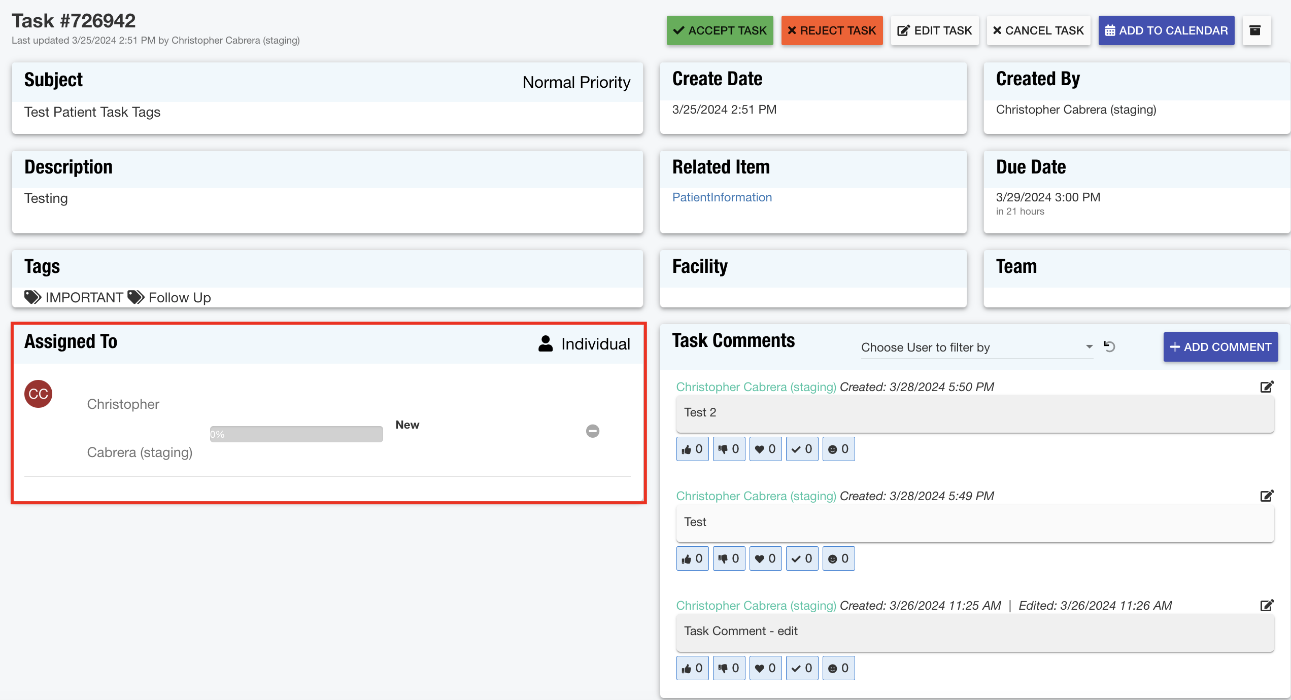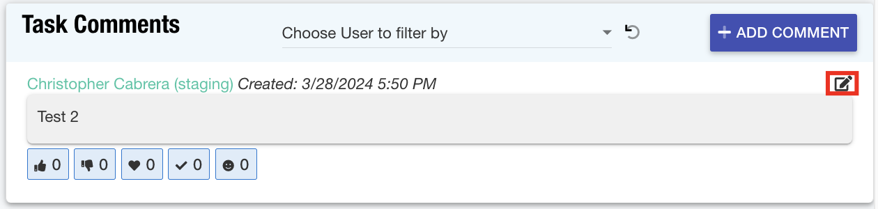 Tasks: The task comments feature has been updated to support edit and/or delete actions created by the user to ensure necessary changes can be made when applicable.