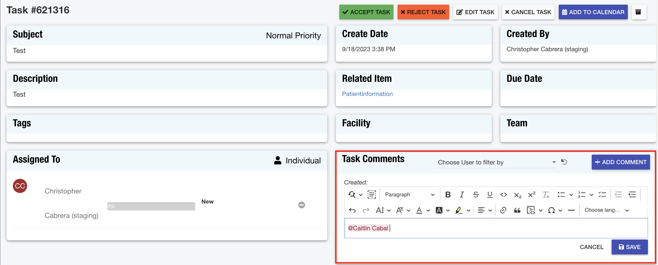 Tasks: The Task Comments area has been enhanced with a WYSIWYG editor, enabling users to customize comments with ease, including the ability to tag other CRM users for improved collaboration and communication.
