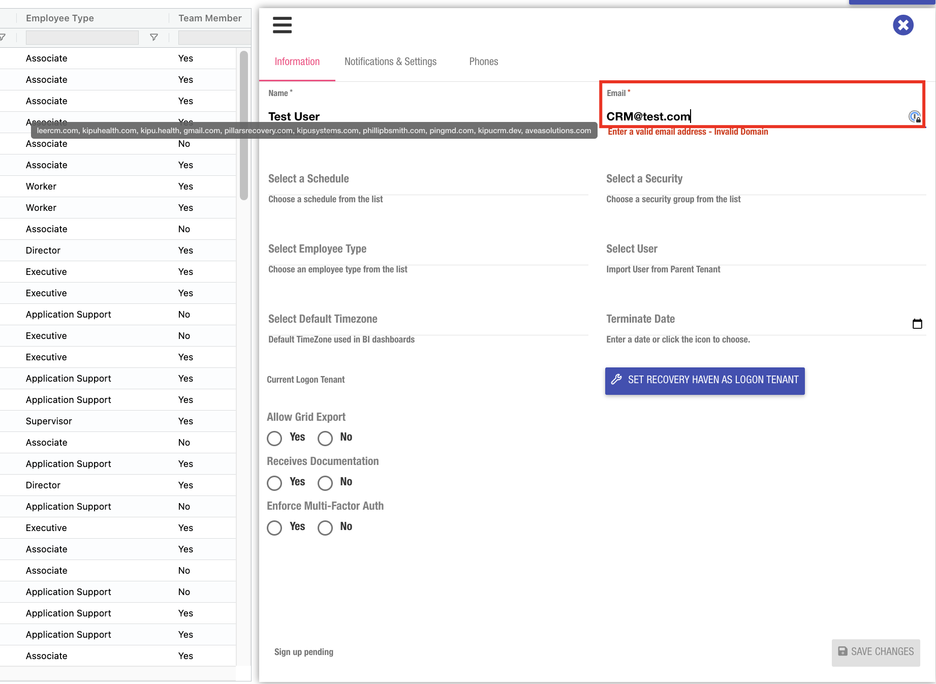 User Management: Enhanced security measures have been implemented in the User Management area, introducing new functionality that restricts user creation to email addresses listed in the domain whitelist. This ensures a more secure system environment by preventing unauthorized domain access.