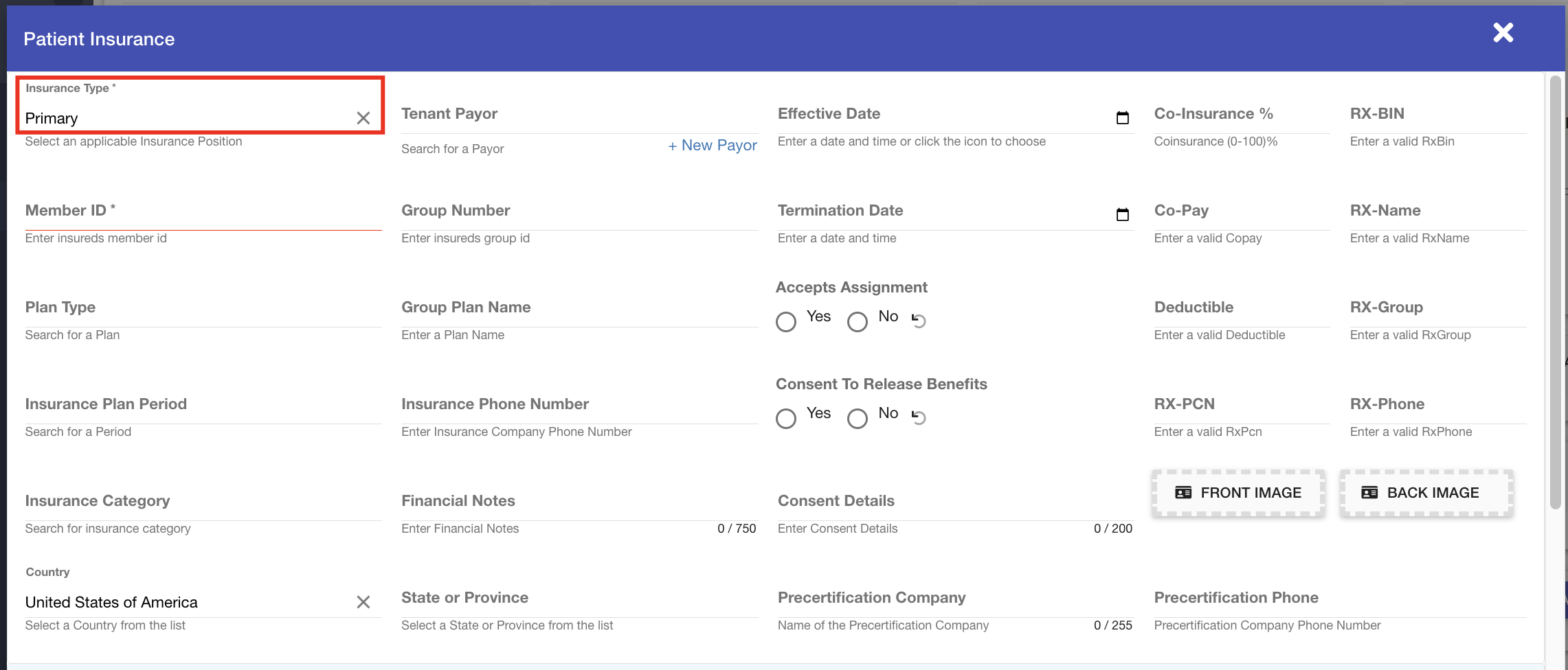 Insurance Records: The Insurance Type field has been enhanced to auto populate based on the types of insurance already present on the patient's record streamlining documentation process. The system will adhere to the following order: Primary, Secondary, Tertiary, Other.