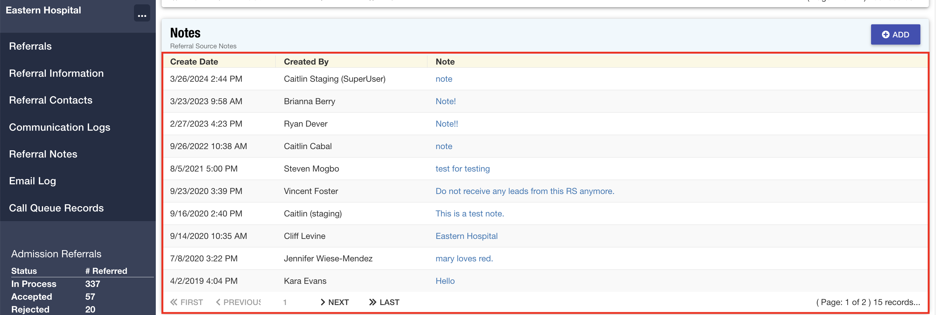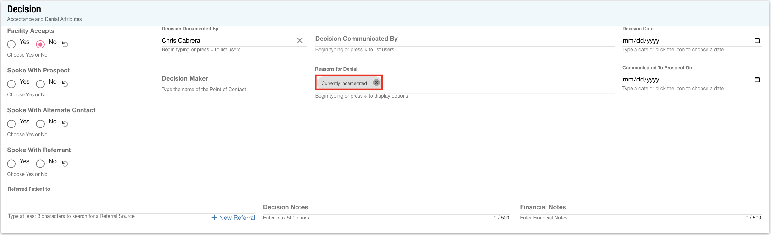 Referral Source: The area for referral source notes has been modified to display records in descending order for increased efficiency.