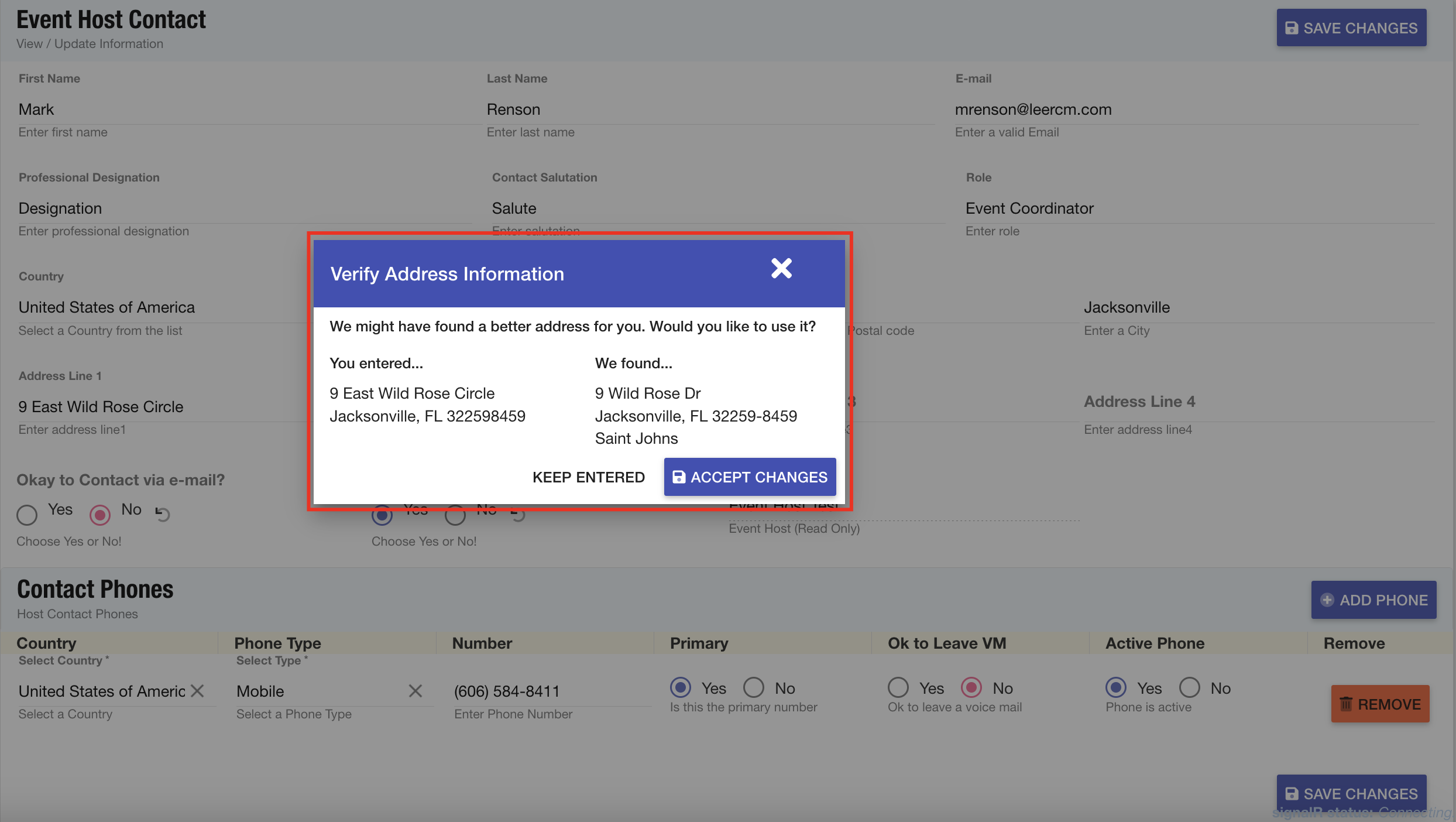 Campaigns & Marketing: The address verification modal for event host contact records has been updated to material design and ES6 for an improved appearance and increased maintainability as we scale the site.
