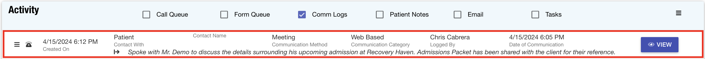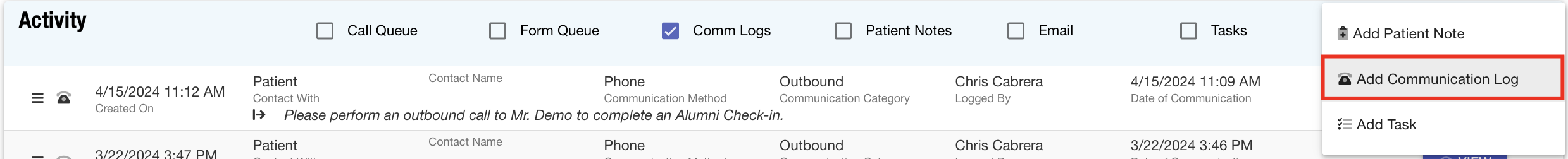 Important: If a follow-up date is present, the task record modal will appear. Please fill out all necessary fields to accurately describe the action that must be completed. For more information on the task feature, please click here. - The communication log will now be available for reference in the Activity section of the patient record.