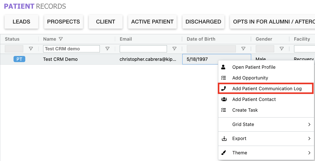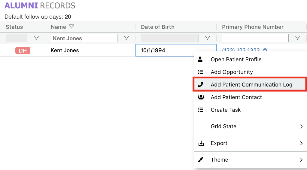 - Prospect/Patient Records Grid: Right-click option