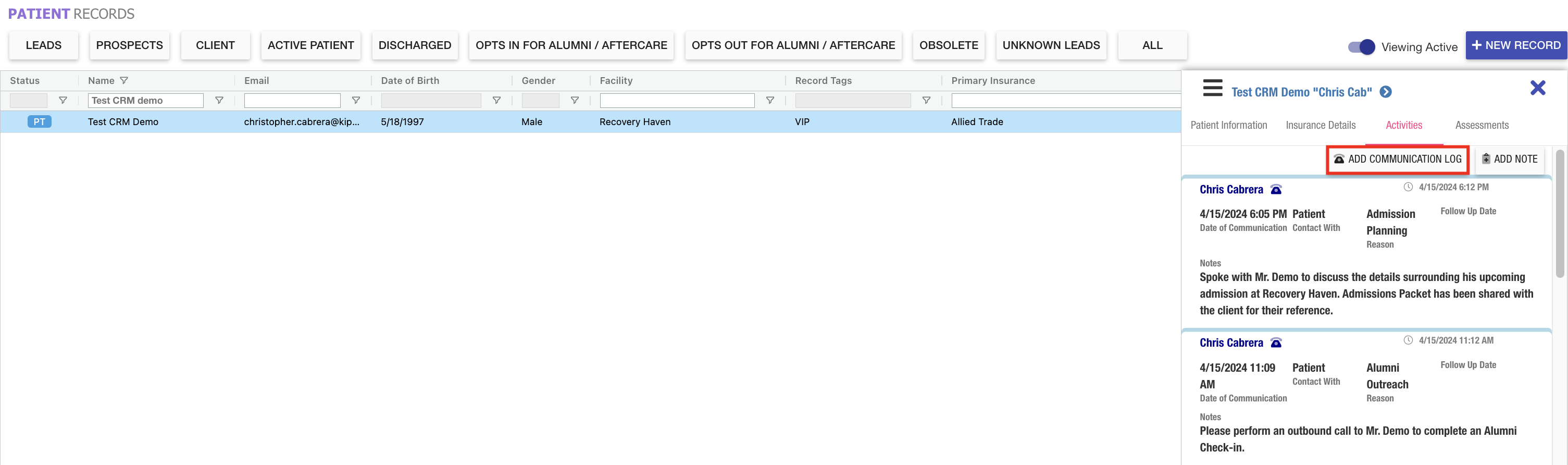 - Prospect/Patient Records Grid: Focus Panel - Activities Tab