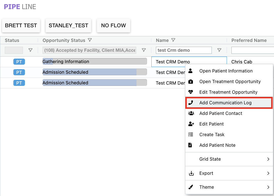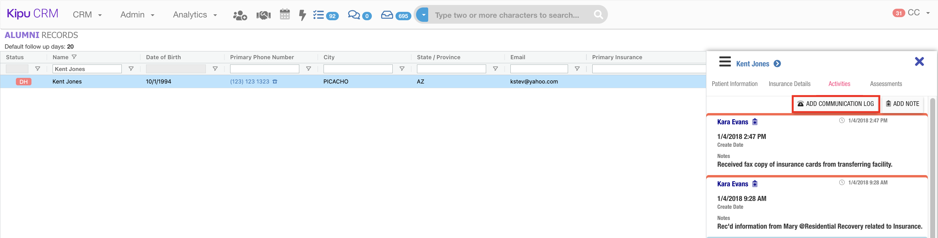 Kipu CRM users can quickly generate communication log records from various areas of the system to promote a more seamless documentation experience. Please see the available areas below.