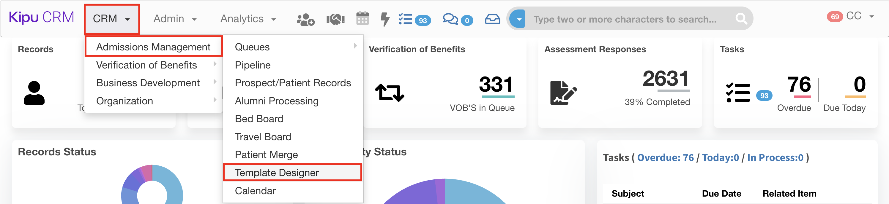 Kipu CRM, Roles: Combined +, Combined (Admissions and B.D.), Super User, VOB Worker, Restricted Admissions Worker | Template Designer