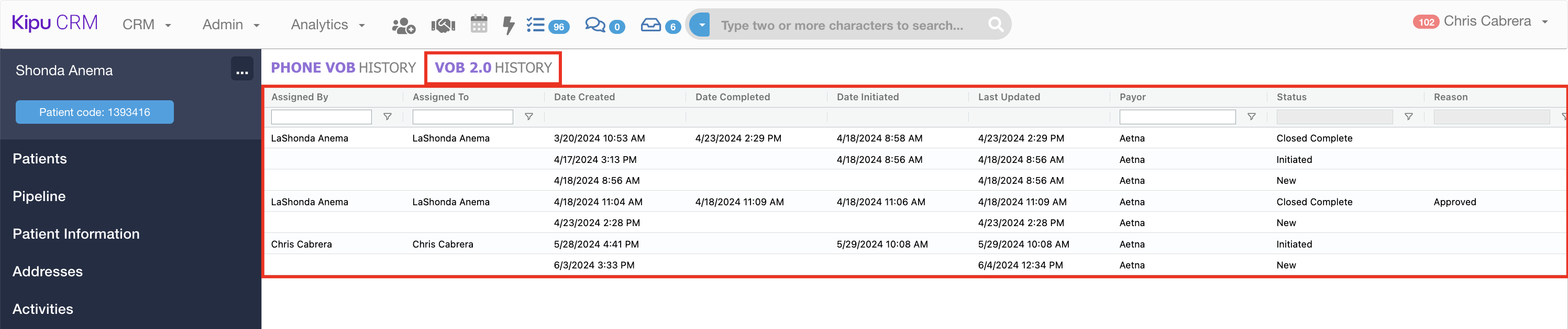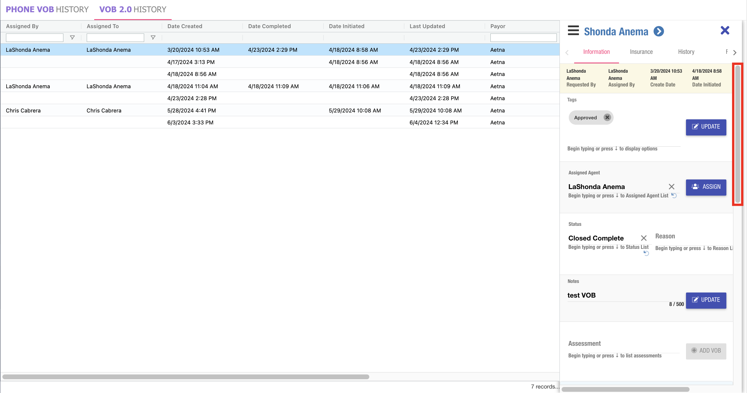 - In the VOB 2.0 History tab, select your desired Phone VOB request from the grid.