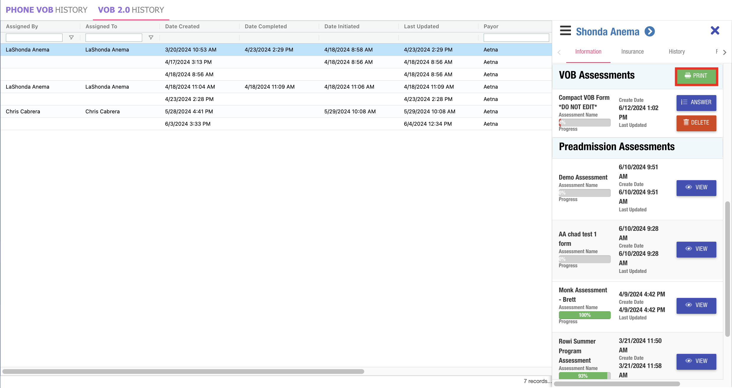 - Once you have located the VOB Assessments section, select Print to generate a PDF copy.