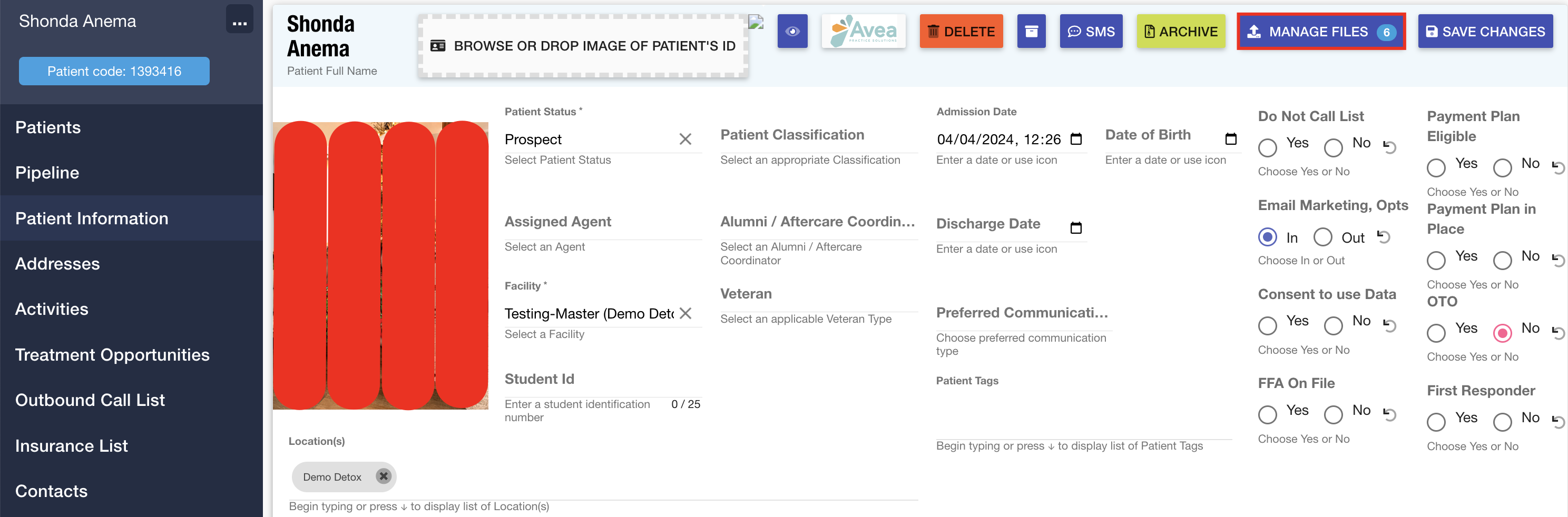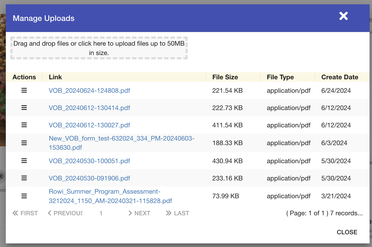 - The Manage Uploads modal will appear, displaying all files that have been associated with the patient record.