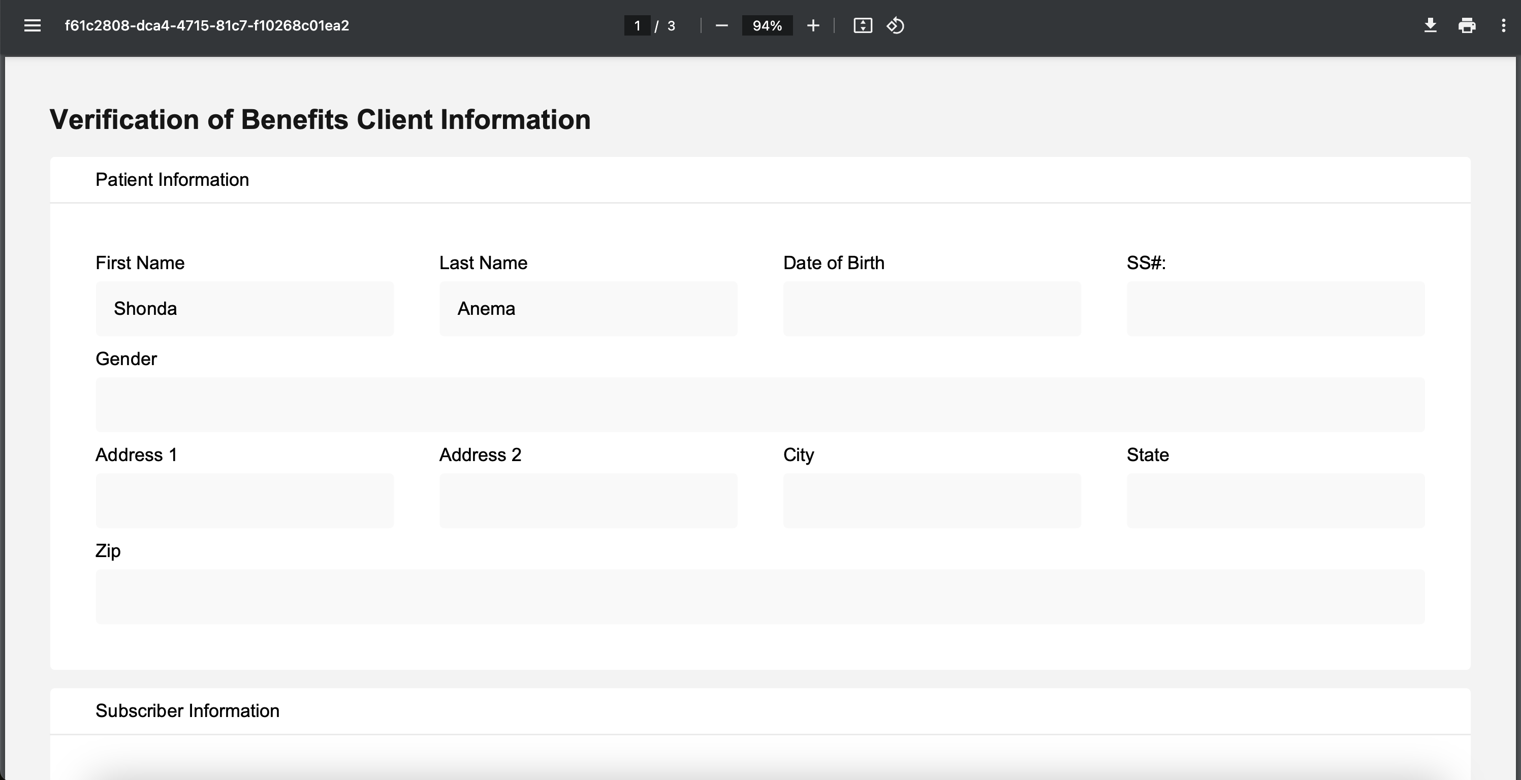 - This will trigger the system to generate a PDF rendering of the VOB assessment. This PDF file will be downloaded locally to your computer and automatically uploaded to the patient's CRM chart for easy access.