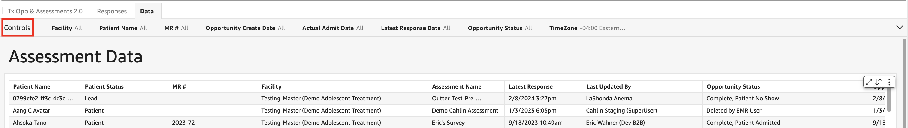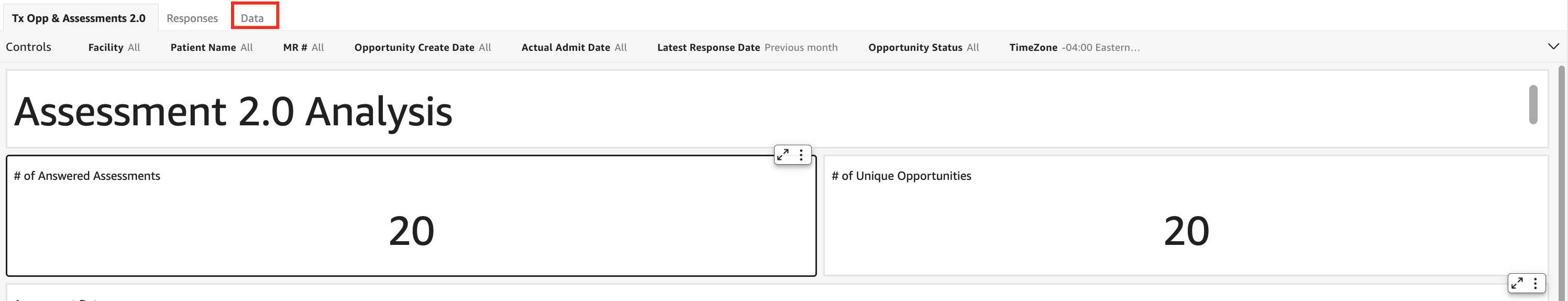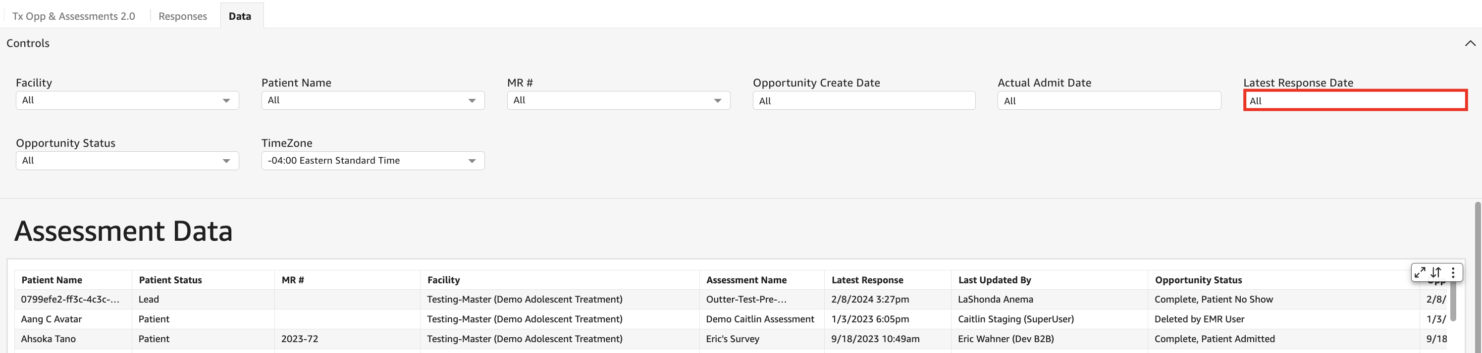 - In the Tx Opp & Assessments 2.0 tab, select controls to access the available filters.