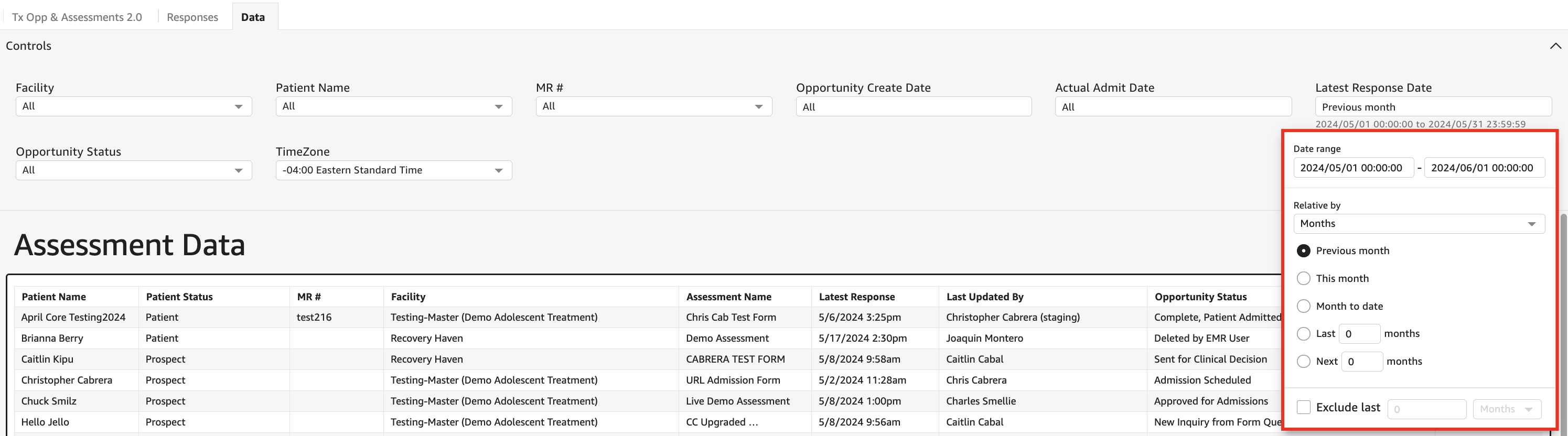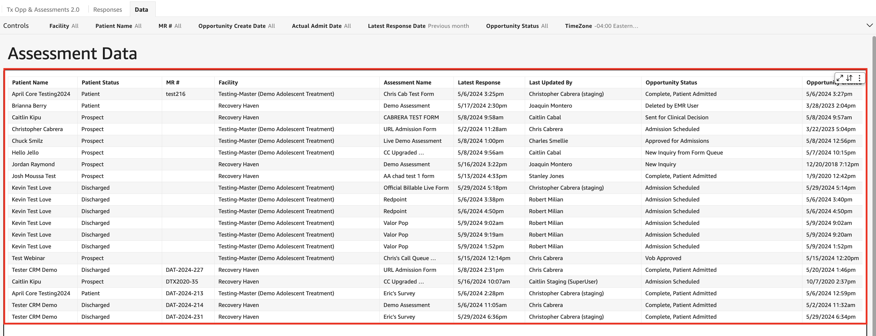 - Once you have applied your desired filters, review the Assessment Data table to view all forms that were completed in the designated timeframe.