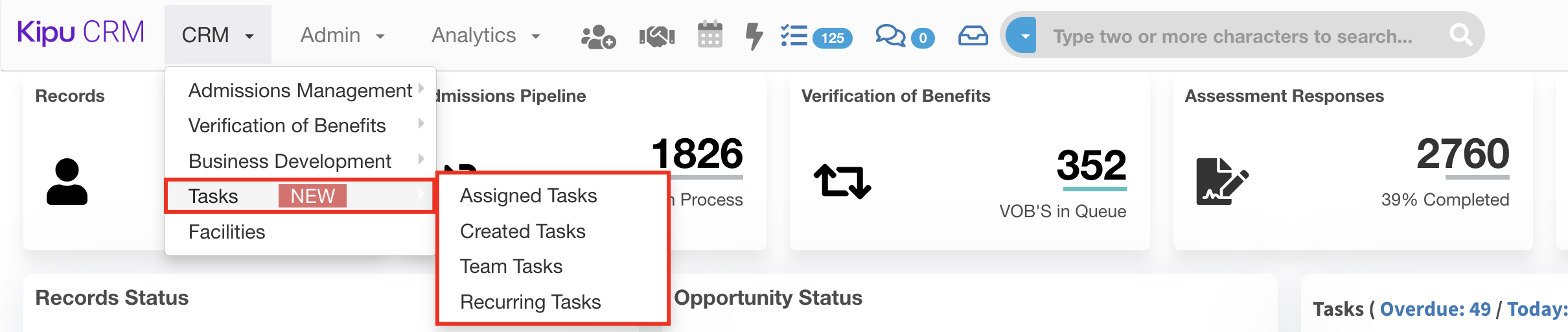 CRM Navigation: A new menu option for Tasks has been added, providing direct links to key task center areas such as Assigned Tasks, Created Tasks, Team Tasks, and Recurring Tasks. This enhancement ensures a seamless navigation experience.