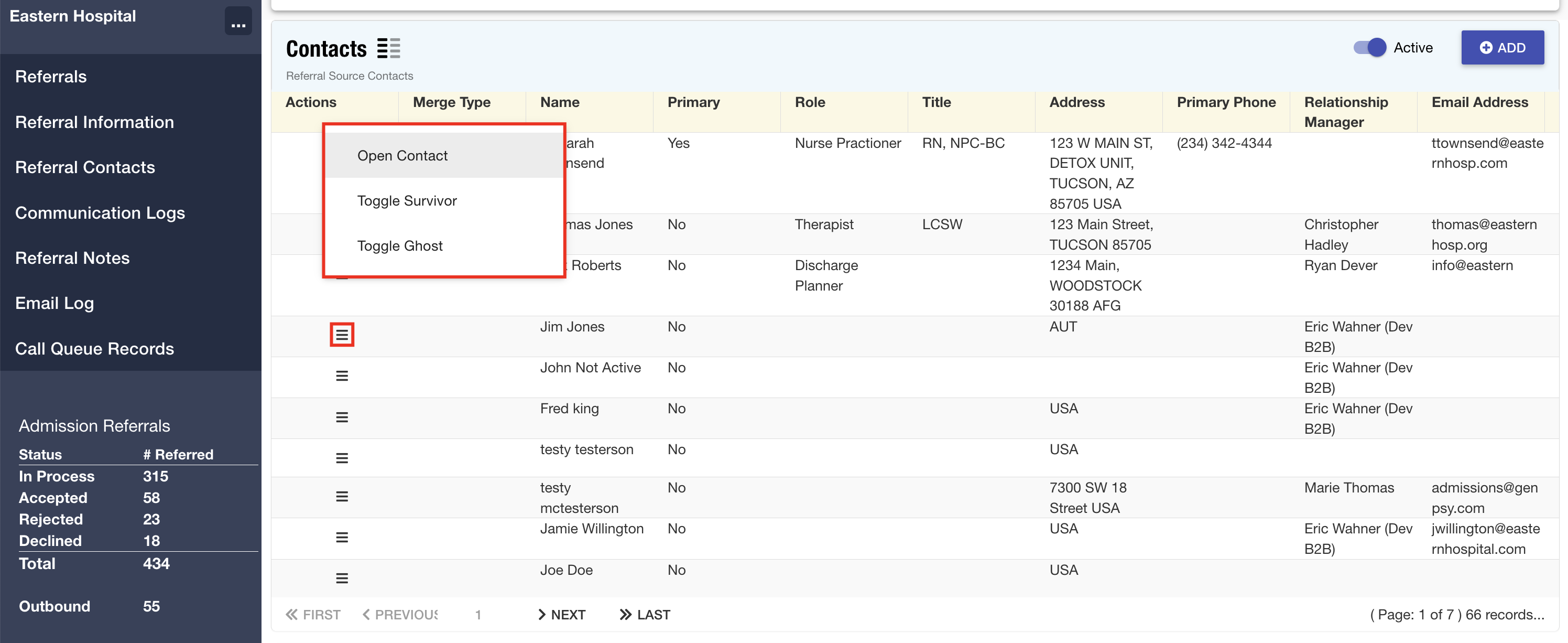 Referral Source Contacts: The referral source contacts area has been enhanced with a new contact merge feature. This update allows users to eliminate duplicate contact records while preserving all key data that may be present.