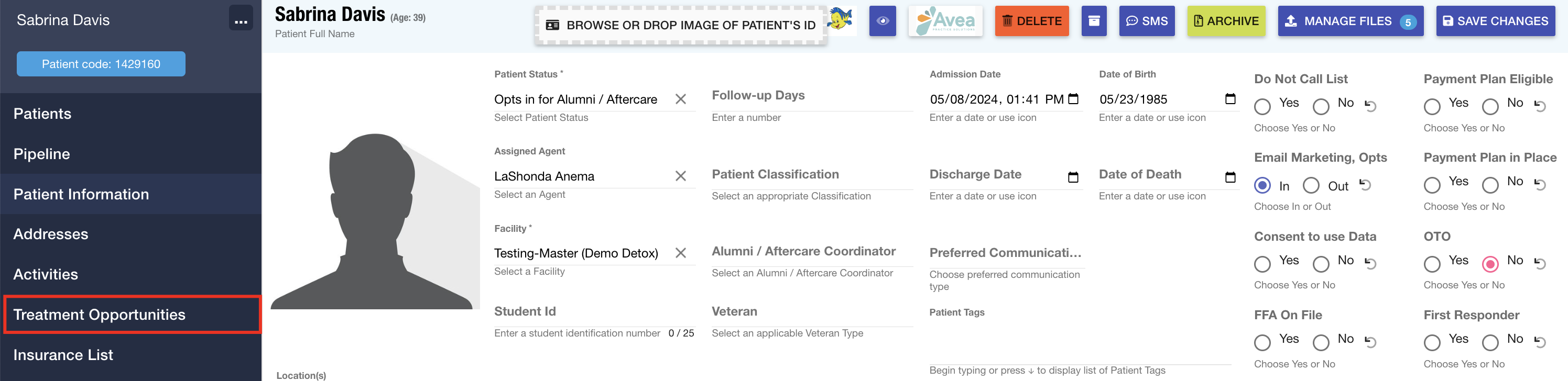 The patient record will appear on screen. Select Treatment Opportunities on the left-side panel.