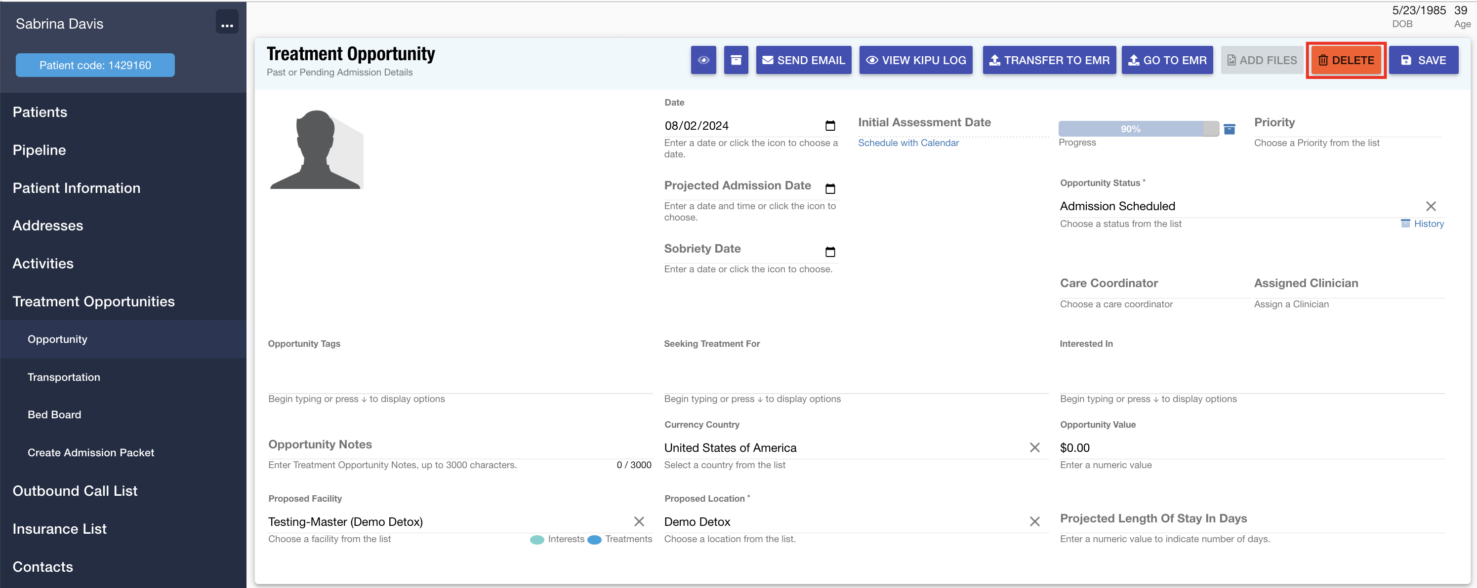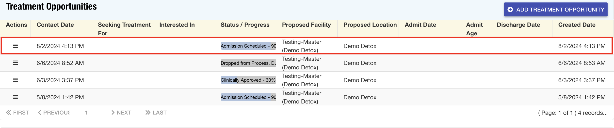 - Select the Treatment Opportunity you would like to delete to access its record.