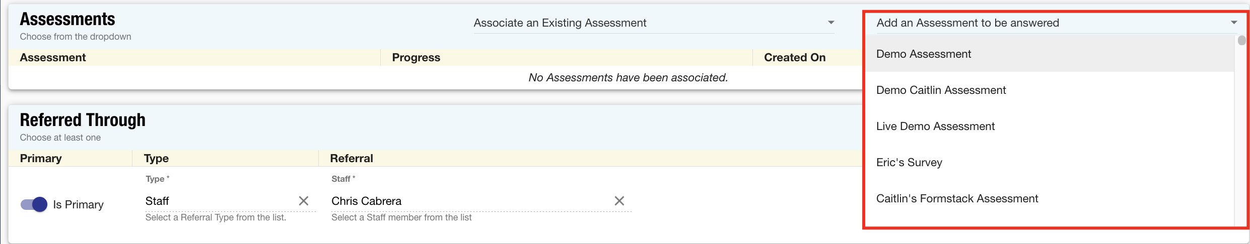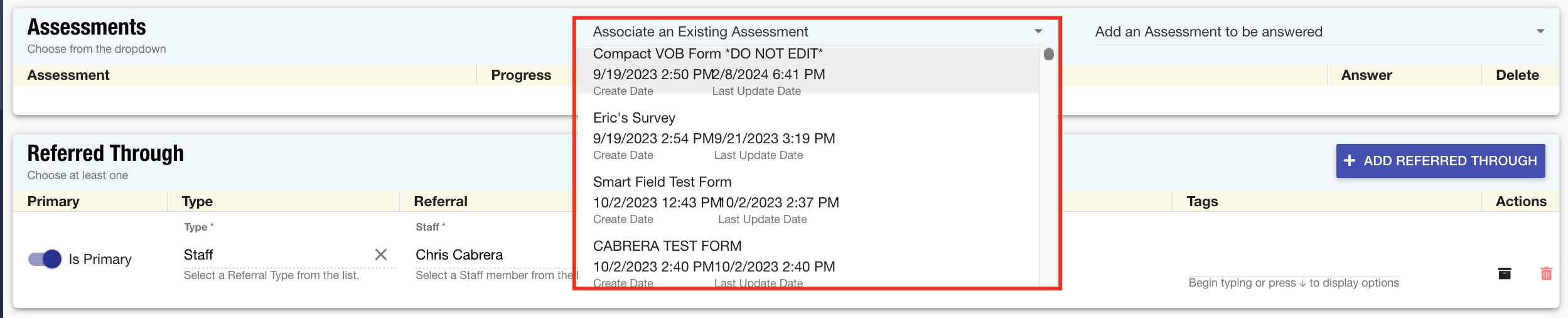 - In the Assessments section, select the Associate an Existing Assessment field to view a list of assessments that have been performed with the patient. Select your desired form from the list.