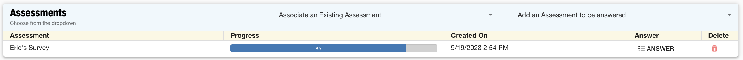 - Once you have associated the desired assessment record, the opportunity will display the assessment name, progress percentage, and created date.