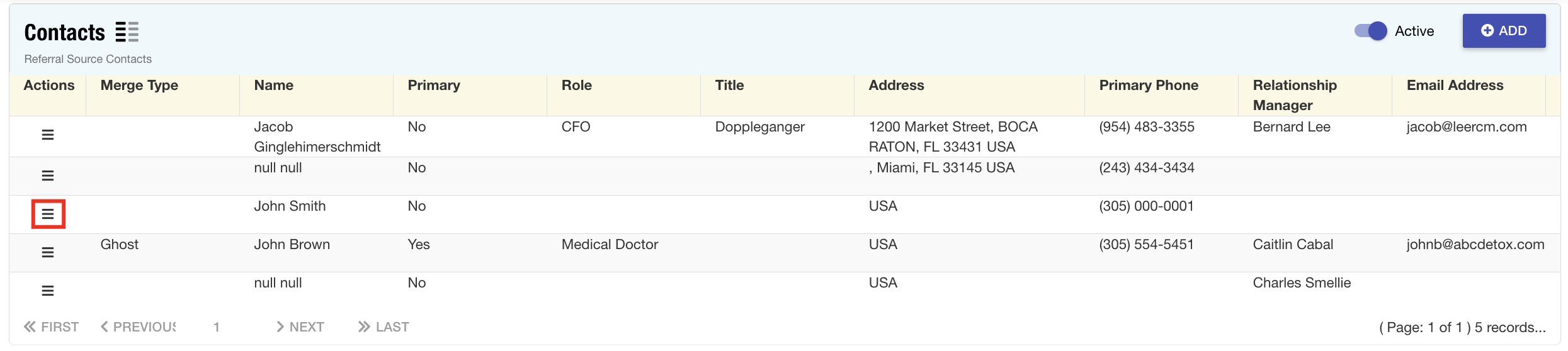 - Select the Action menu on the Referral Source contact record that you would like to designate as the Ghost.