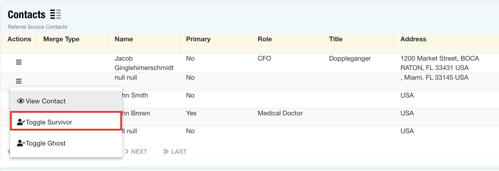 Next, select the context menu icon on the Referral Source contact record that you would like to designate as the Survivor.