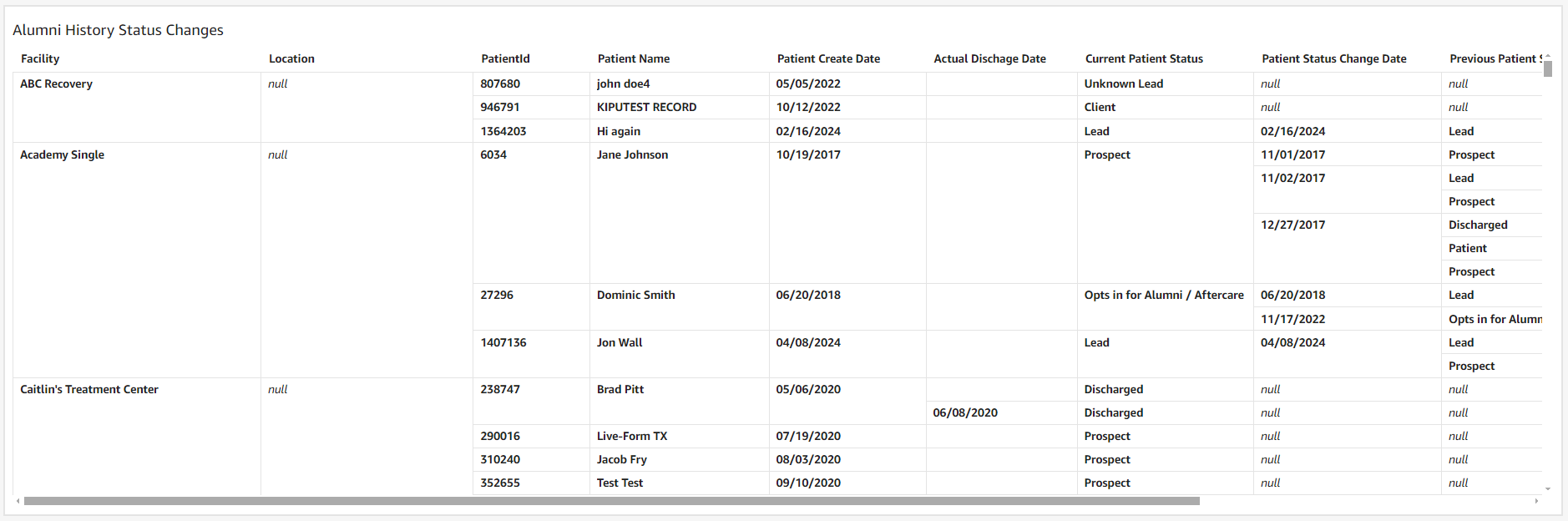 - Current Patient Status: Used to filter the data based on the current status of the patient record. (Client, Discharged, Lead, Obsolete, Opts in for Alumni / Aftercare, Opts Out for Alumni / Aftercare, Patient, Prospect, Student, Unknown Lead)