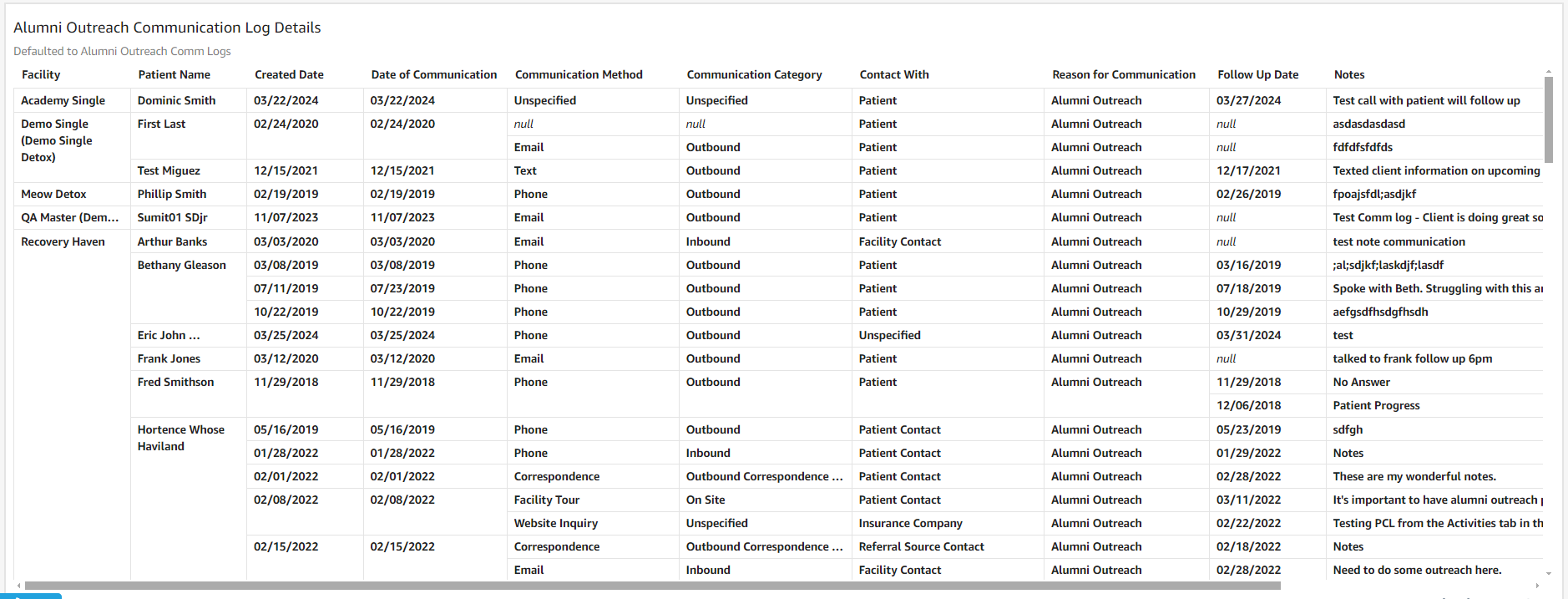 Alumni Outreach Communication Log Details: This table provides insights into patient communication logs categorized as Alumni Outreach, highlighting interactions between alumni coordinators and alumni clients.