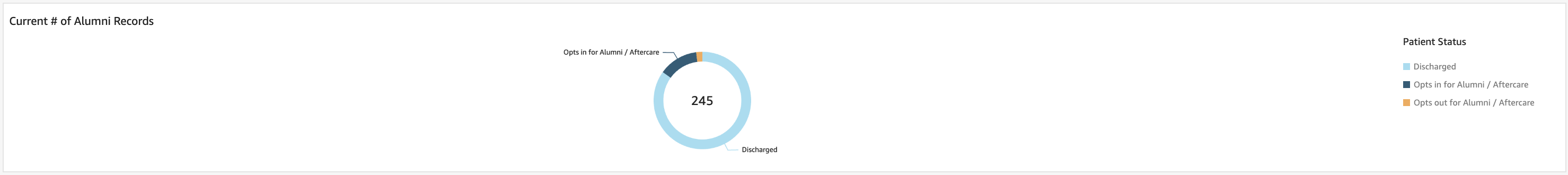 Current # of Alumni Records: This widget displays the current number of alumni records, segmented by patient status. The donut chart visually represents the proportion of patients who are discharged, those who opted in for alumni/aftercare, and those who opted out. The total count of alumni records is shown at the center, providing a quick overview of the data distribution.