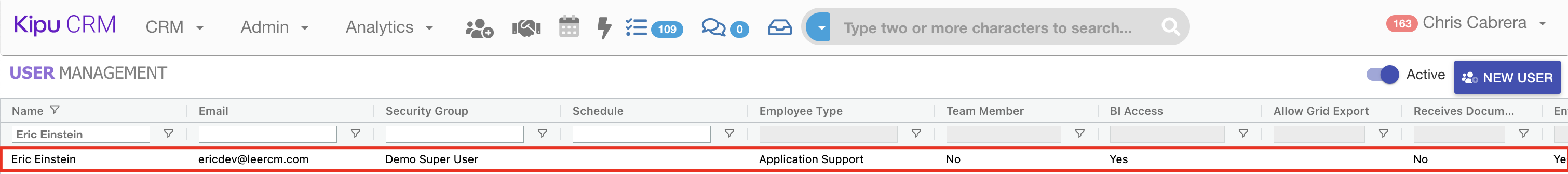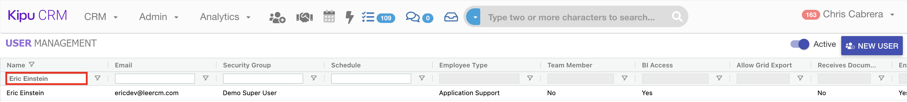 - Using the Name column, type in the name of the desired user you would like to edit.