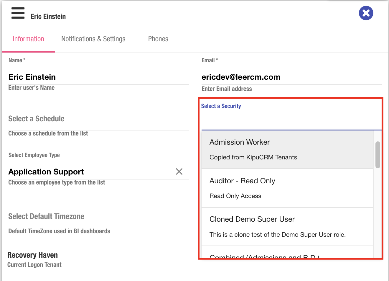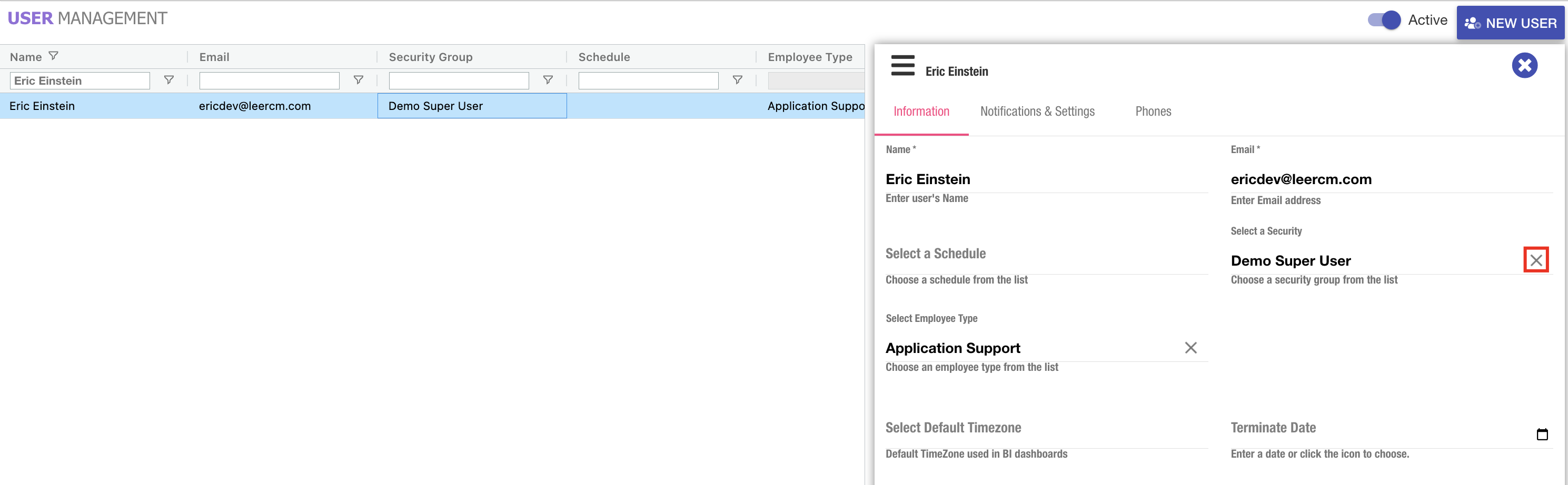 - The user focus panel will appear on the right-side of the screen. Select the X icon on the Select a Security field to remove the current security role assigned to the user.