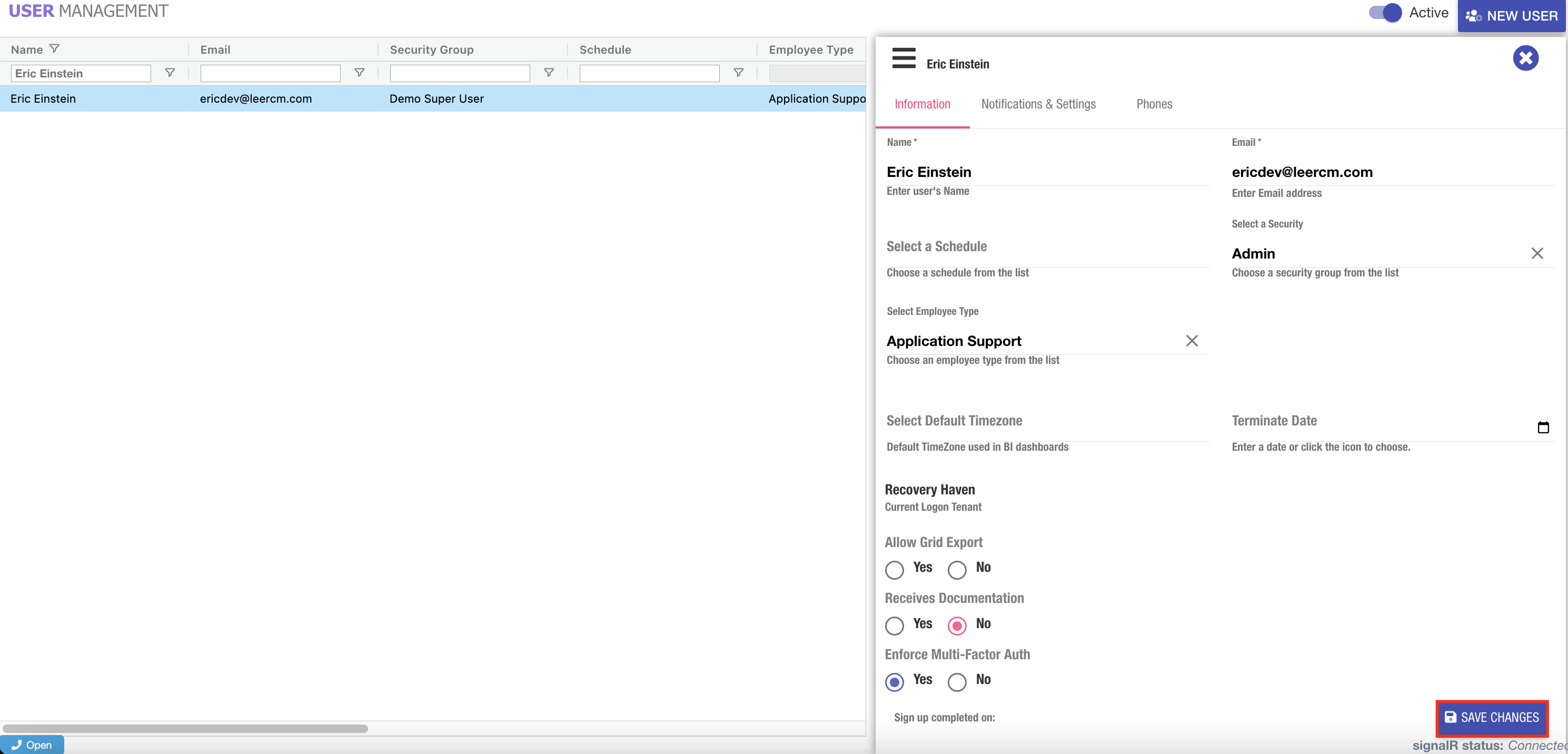 - Left-click anywhere in the row containing the user you would like to edit in order to populate the user focus panel.