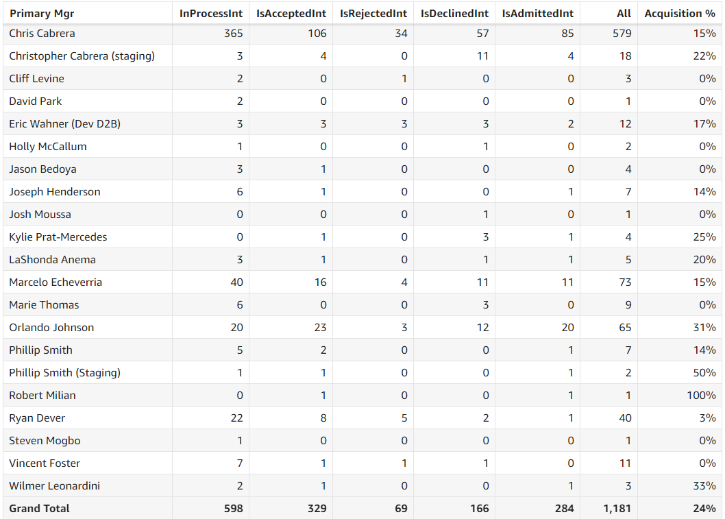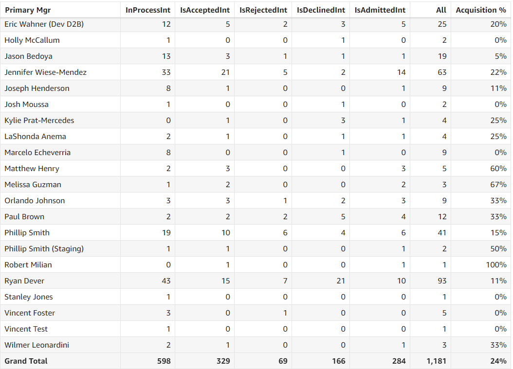 Treatment Opportunities by Primary Relationship Manager: This grid presents a detailed breakdown of treatment opportunities associated with each Primary Relationship Manager. The outcomes are classified as Rejected, In Process, Declined, or Accepted, based on the opportunity status.